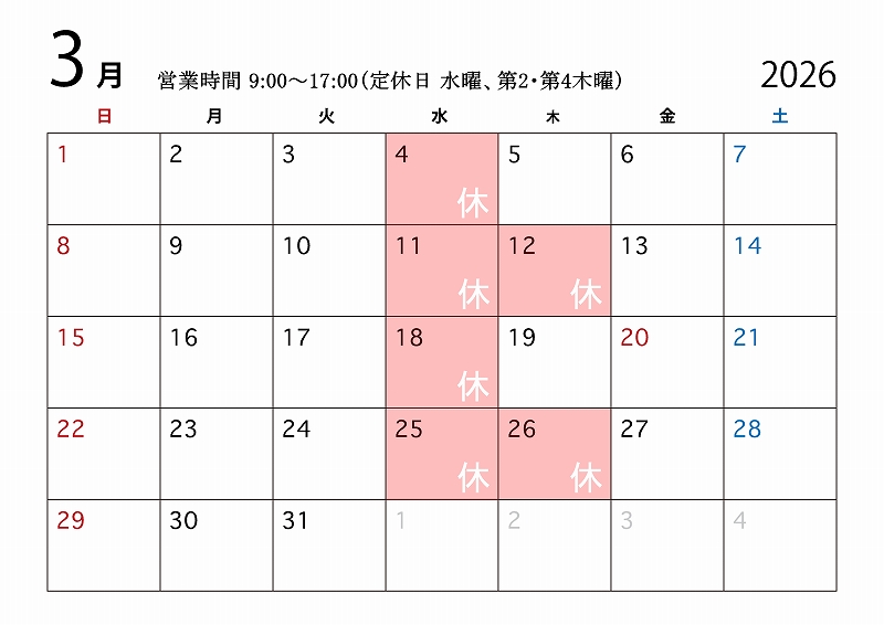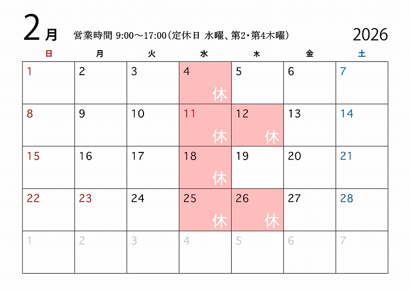 2月の営業日につきましてはカレンダーをご覧下さいますようお願いいたします。